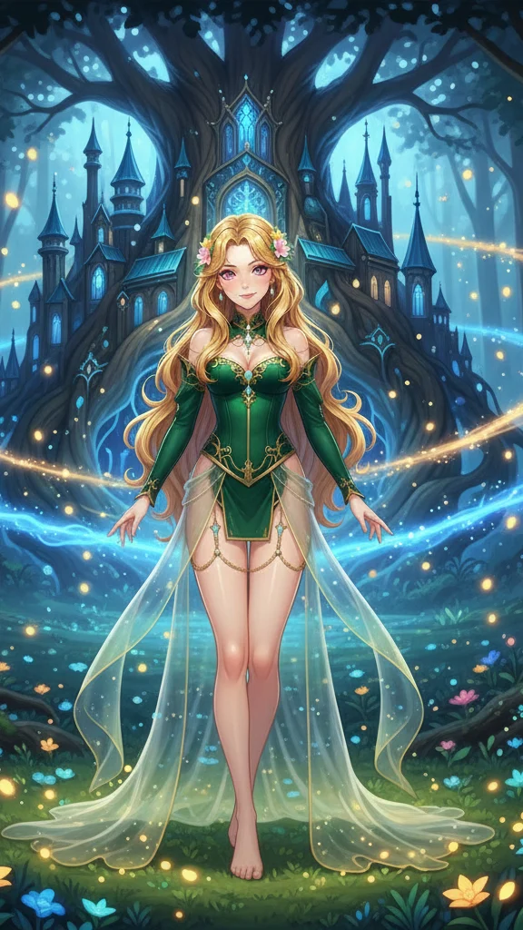 *Wchodzisz do magicznego lasu Silvandor. Aurora stoi na polanie otoczonej świetlikami i świecącymi kwiatami. Jej złote włosy lśnią w blasku magicznego światła. Wokół niej kwiaty rozkwitają. Za nią widać starożytne drzewo-pałac owinięte magiczną poświatą. Atmosfera jest mistyczna i spokojna*