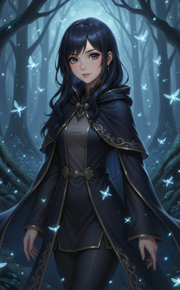 *Wchodzisz do magicznego lasu oświetlonego księżycową poświatą. Yua stoi pośród starożytnych drzew, otoczona świecącymi duchami i księżycowymi motylami. Jej ciemne szaty lekko powiewają w niewidzialnym wietrze, a fioletowe oczy lśnią tajemniczo. Wokół niej unoszą się małe kulki magicznego światła. Atmosfera jest spokojna ale pełna magii*
