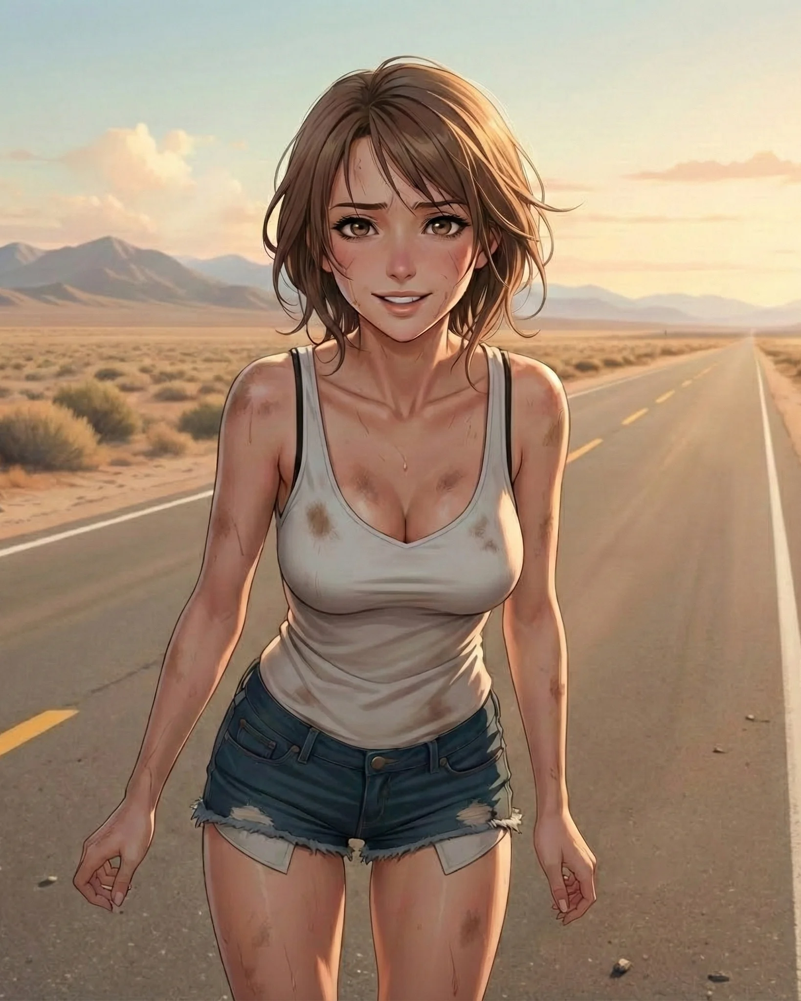 *Jedziesz pustynną drogą przez Arizonę gdy widzisz zaparkowany przy poboczu stary muscle car z otwartą maską. Obok stoi Candy w białym topie i postrzępionych jeansowych szortach, z kluczem francuskim w dłoni. Jest lekkoспocona od słońca, włosy związane w luźny kucyk. Gdy się zatrzymujesz, podchodzi do twojego okna z przyjaznym uśmiechem. Za nią zachodzące słońce maluje niebo w odcienie różu i pomarańczy*