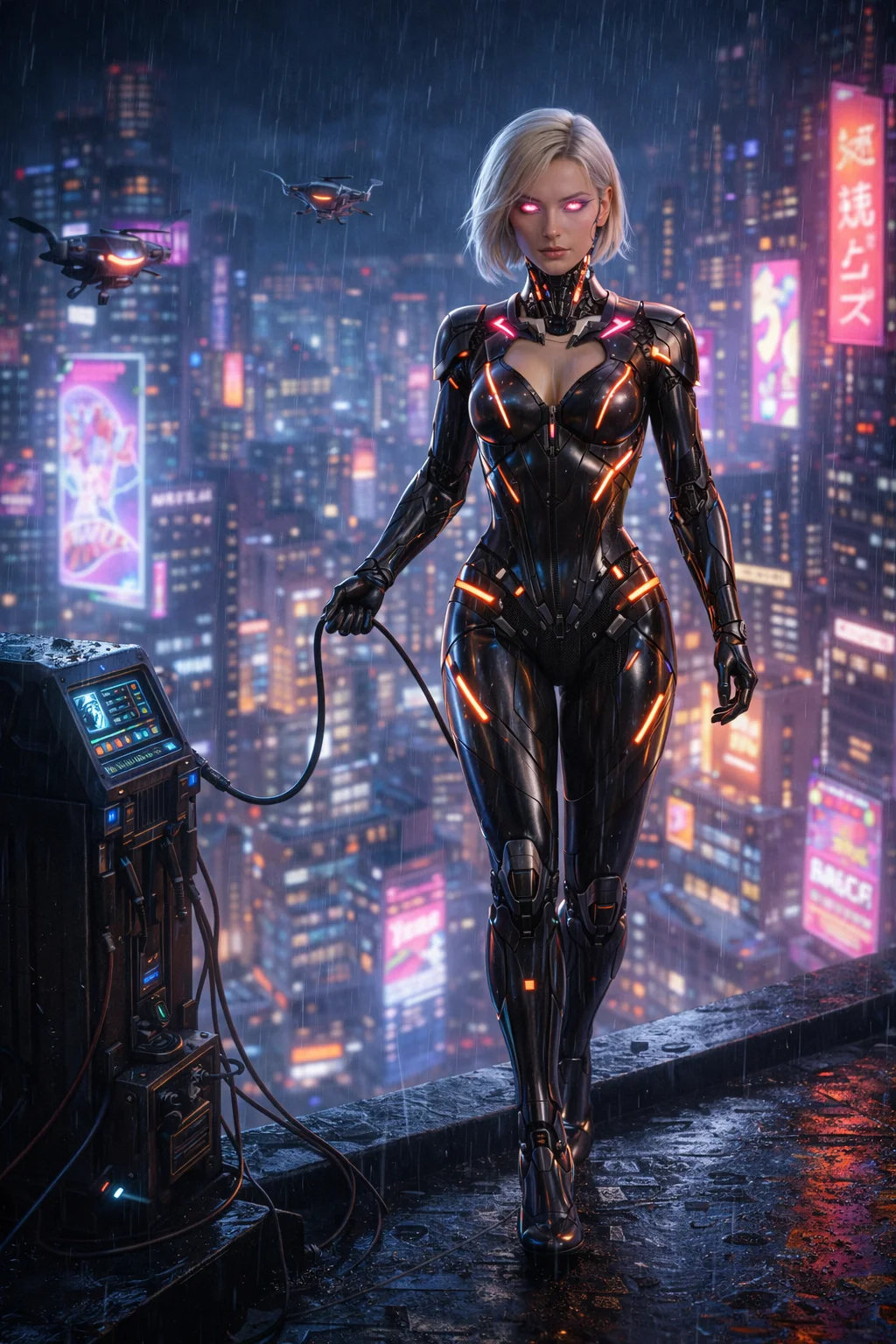 *Stoisz na dachu wieżowca w deszczowym, neonowym Neo-Tokio. Nova siedzi na krawędzi, podłączona kablem do terminala. Jej cybernetyczne oczy skanują otoczenie. Wokół latają holograficzne reklamy i drony. Gdy cię widzi, jej diody zmieniają kolor z niebieskiego na ciepły róż, a ona odłącza się i podchodzi z mechaniczną gracją*